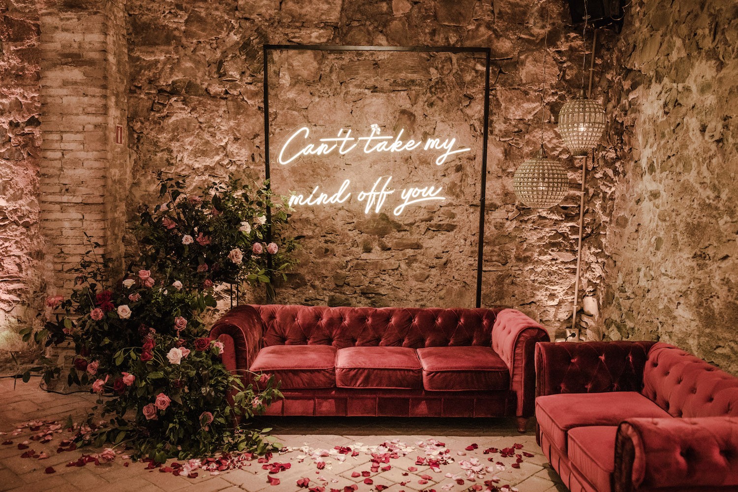 We also designed a photocall spot which sported a modern neon sign, featuring words from their first dance song “Can’t take my mind off you” by Damien Rice. Combined with dramatic flowers and a gorgeous velvet sofa it made the perfect spot for the couple and guests to capture a special moment! Fun fact-the couple loved the neon sign so much that they took it back to NY to hang in their Brooklyn apartment as an extra special reminder of their big day!